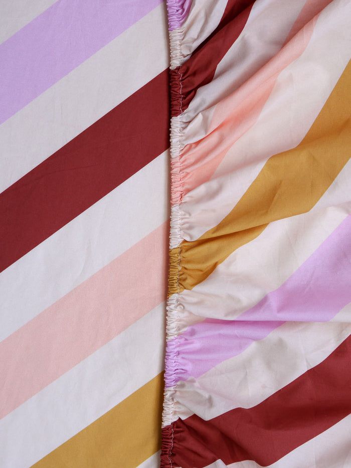 Sleep soundly on our Crimson Maypole Fitted Sheet. Made from 100% combed cotton percale for a soft texture, this sheet features a bold diagonal stripe pattern in a palette of rich burgundy, soft lilac, sweet peach and warm caramel.