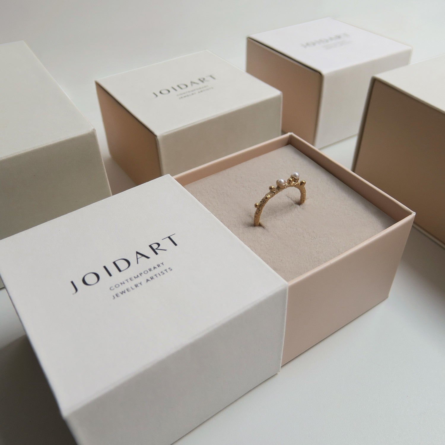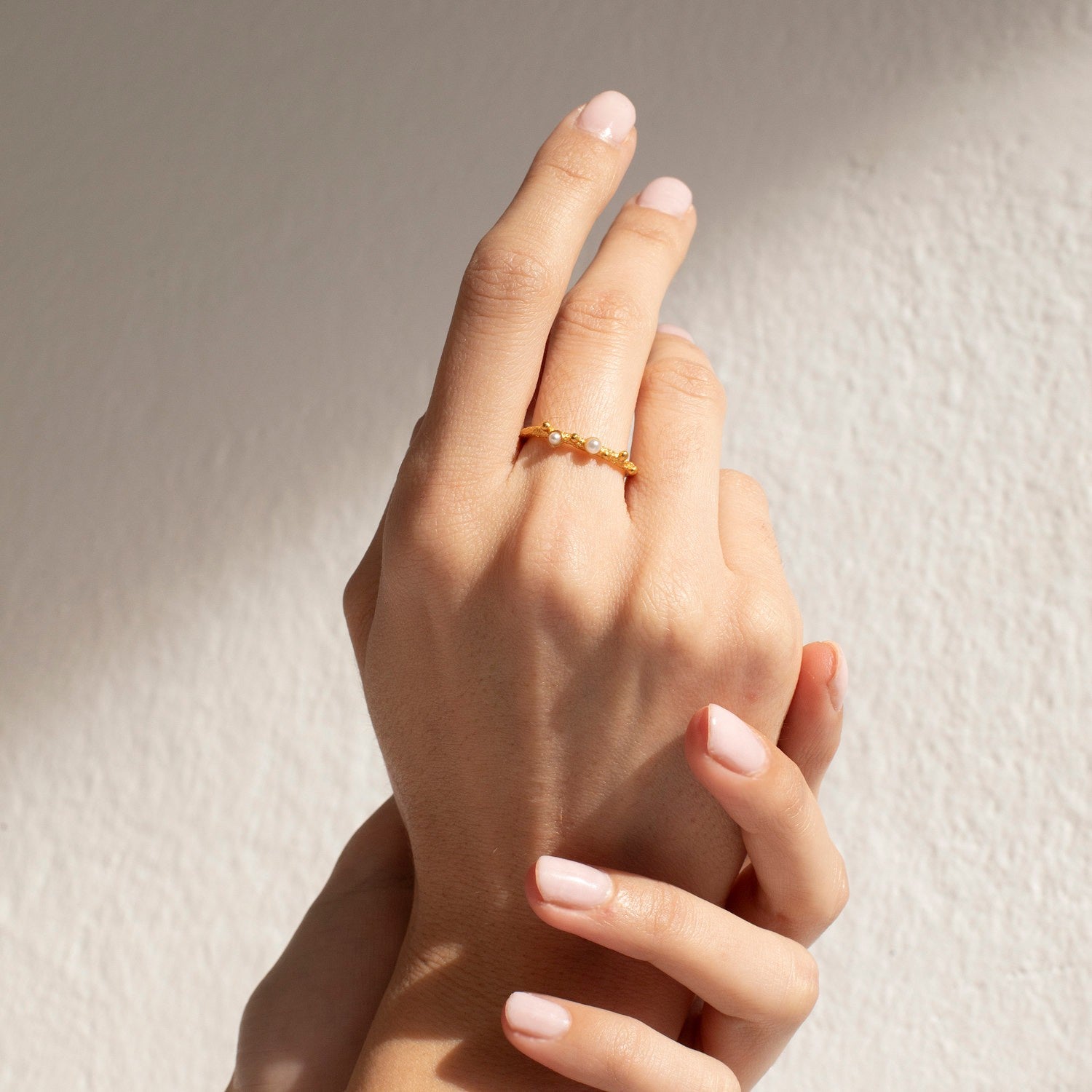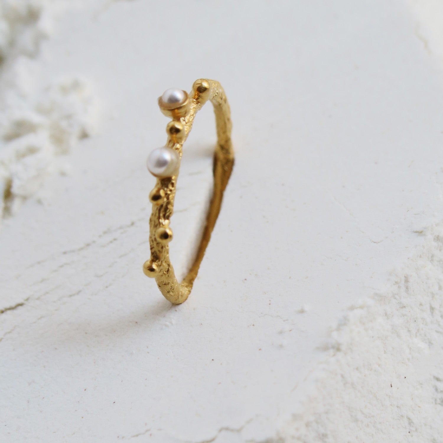 Textured golden ring with metal balls and delicate resin pearls. In 24 K gold-plated 925 sterling silver.